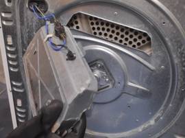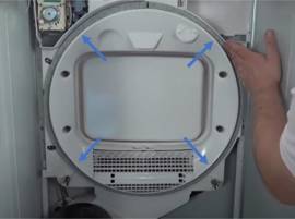 In questo caso, dovrai sostituire l'albero o il tamburo con il relativo cuscinetto a seconda del modello della tua asciugatrice. E’ necessario sganciare il tamburo dall'interno, in basso.